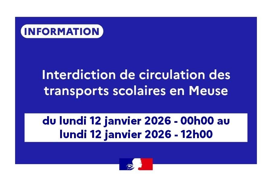 🚫 En concertation avec l'ensemble des partenaires (conseil régional, conseil départemental, services de l’État) et considérant que les conditions de circulation ne présentent pas toutes les garanties de sécurité, un arrêté préfectoral interdisant la circulation des transports scolaires a été pris sur la plage horaire la plus délicate, soit du lundi 12 janvier 2026 à minuit jusqu'au lundi 12 janvier 2026 à 12h sur l'ensemble du département de la Meuse.