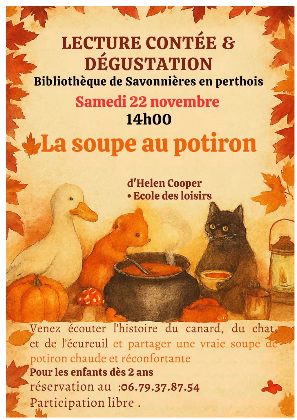 Venez écouter l’histoire du canard, du chat et de l’écureuil, puis déguster une vraie soupe de potiron chaude et réconfortante 😋